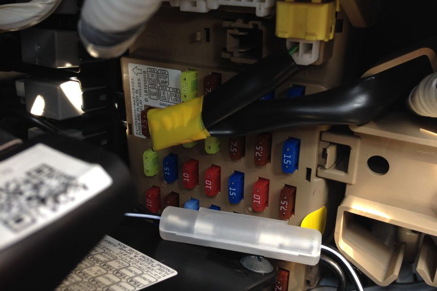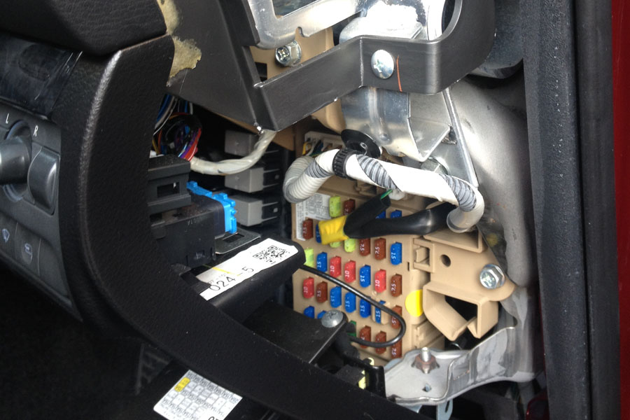 本体の取り付けは簡単はマジックテープで固定するだけですから簡単です。シガーソケットから電源を取るのは配線が不細工ですからパス。運転席の右側にあるヒューズボックスから電源を取り出しました。