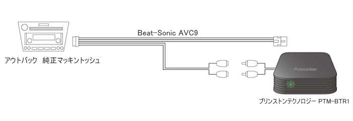 調べて見るとiPhoneやスマホを簡単にブルートゥース接続出来るミュージック・レシーバーがリーズナブルな価格で販売されていることを知りました。今回はプリンストンテクノロジーのPTM-BTR1を選びました。これらの機器を下図のように接続にするとワイヤレスでiPhoneの音声出力を純正オーディオのAUX入力に接続することが出来ます。