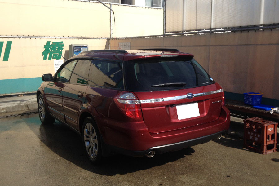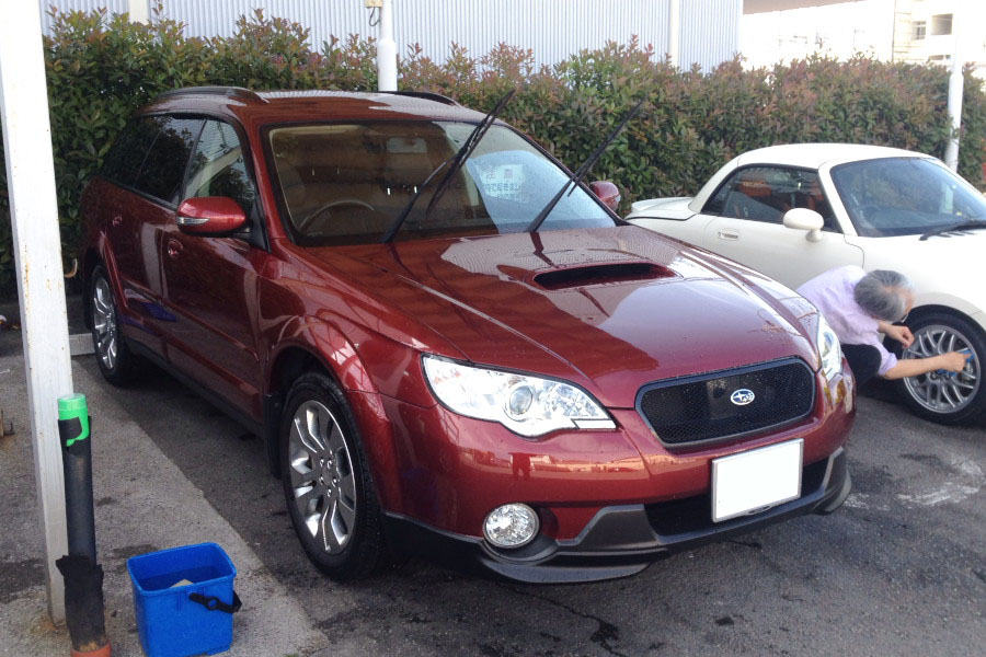 拭き上げ場に移動、念入りに拭き上げます。ボンネットには野良猫に付けられたシミがありましたので、下地作り用のコンパウンドで処理しました。ポリラックによるコーティングは手慣れたものですがアウトバックはルーフの面積が広い。ロードスターでは未体験の作業です。
