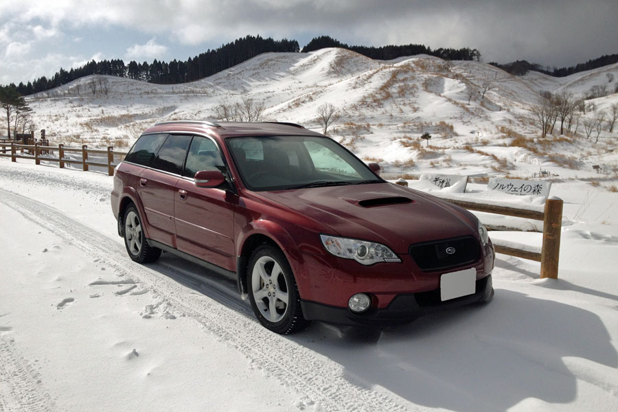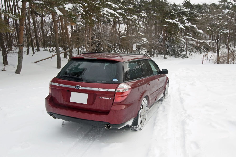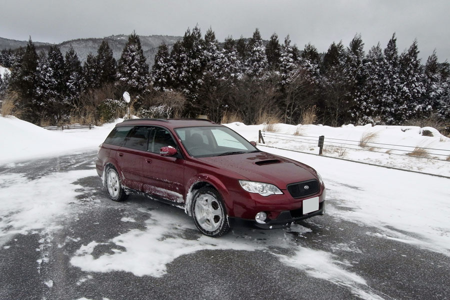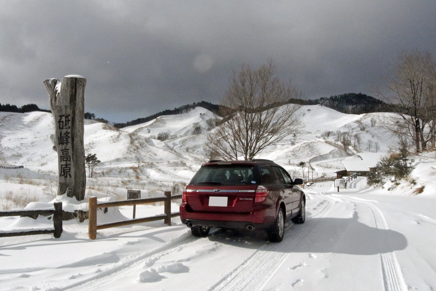 午前8時に峰山高原に到着。ここまでの雪道はアウトバックには余裕。スタッドレス+AWD+VDCの組み合わせは強力でした。横滑り防止装置を持たないFRのロードスターでは慎重な運転が要求されますがアウトバックでは雪道ですら楽しい。車の挙動が怪しくなってくるとVDCが警告音を出してくれます。車がスライドを始めても軽くカウンターを当てるだけで簡単に収まります。アウトバックなら一般的な雪道でハマることはないと思います。