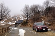 林道の入り口の広場あたりからは完全な雪道。それも水分を含んだ重い雪でスタッドレスでもなかなか雪を掴んでくれないような状況でした。苦労しながら林道を進んだのですが2/9と同じ場所で前に進めなくなりました。四輪にチェーンでも巻かないと無理なようです。